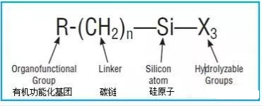 硅烷偶联剂的通式通常显示两类官能团。X是可水解基团,通常是烷氧基,酰氧基,卤素或胺。水解后,形成活性硅烷醇基团,其可与其它硅烷醇基团(例如,硅质填料表面)缩合以形成硅氧烷键。也可以与其它氧化物例如铝,锆,锡,钛和镍的那些形成稳定的缩合产物,或与硼,铁和碳的氧化物形成不太稳定的键。碱金属氧化物和碳酸盐不与Si-O-形成稳定的键。R基团是不可水解的有机游离基,它可能是具有一些特殊功能的官能团而产生预期的一些功能。