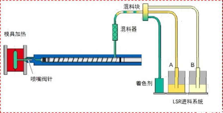 液态硅胶注射成型(Liquid Injection Molding System,简称LIMS) LIMS液体矽利康注塑LIMS(Liquid Injection Molding System)液态矽利康注塑系统是通过把具有出色性能的液态硅橡胶,和能够精密且稳定地完成注射成型的设备相结合而形成的新型加工系统。只需将A/B两种液态材料装入设备内,C是液态注塑色浆,从混合到成型全自动完成,在追求简化工艺和缩短加工时间的同时,能很方便地实现高质量制品的加工。不仅如此,利用液态硅橡胶的各种特性,还能够广泛应用于以电气、电子、汽车、食品为代表的各种行业。LIMS着眼于生产能力的提高和人工费用的降低,完美地体现了出色的经济效能。A: Liquid silicone rubberB: Liquid silicone rubber加热止回流阀开关阀控制矽胶量C:硅胶色浆