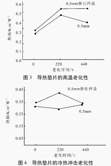 一款新产品的升级换代,一般都需做可靠性对比测试。可靠性测试包括高温老化测试、冷热冲击老化测试和湿热老化测试。在产品升级换代过程中,客户要求导热垫片老化440h后,其导热性能不低于原参比样品。可靠性测试结果见图3~图5。
