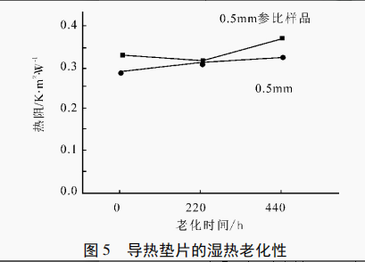 由图3~图5可见,导热垫片150℃老化440h的过程中,热阻低于参比样品;冷热冲击老化440h过程中,导热垫片热阻低于参比样品;湿热老化440h过程中,导热垫片热阻低于参比样品。
