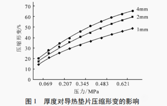 压缩形变也是高性能导热垫片的重要指标,压缩形变越大,产品柔顺性越好,更易于贴合紧密,界面热阻越小,从而达到更好的导热效果。不同厚度的产品有不同的压缩形变,一般情况下,压缩形变压缩速率为0.5mm/min,厚度对导热垫片压缩形变影响见图1。