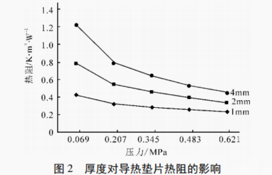 高性能导热垫片特征之一就是低热阻,热阻越低,导热效果越好。不同厚度的产品热阻不同。厚度对导热垫片热阻的影响见图2。