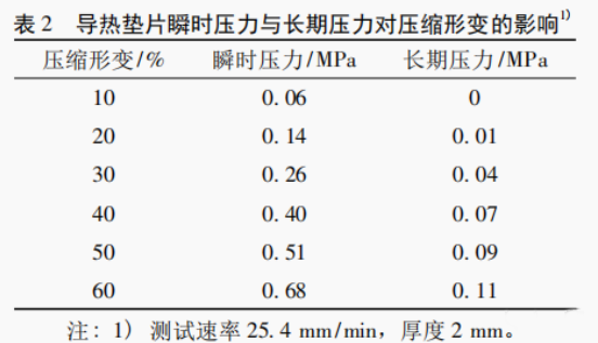 导热垫片瞬时压力及长期压力测试结果见表2。