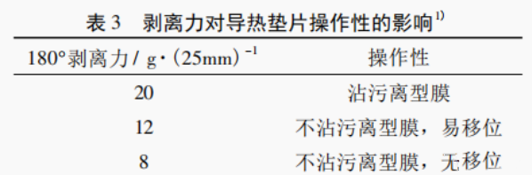 导热填料添加量大,导热垫片的热导率高,但产品的本体强度变小,严重的也会沾污电子元件,产品有环保方面的缺陷。因此,高性能导热垫片设计时要考虑剥离力与产品操作性的关系。一般来讲,薄制品要求操作性高于厚制品。即使导热垫片不沾污离型膜,但在揭掉离型膜的过程中,薄的导热垫片如果剥离力较大,离型膜会将导热垫片带起移位,影响使用。剥离力对导热垫片操作性的影响见表3。