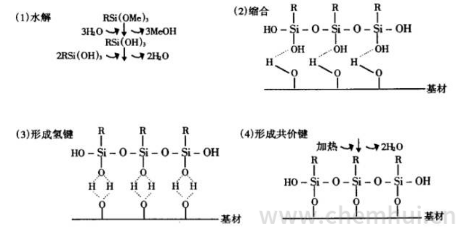 硅烷中的基团水解--水解后羟基与无机填料反应--经偶联剂处理的无机料填进行填充制备复合材料时,偶联剂中的R基团将与有机高聚物相互作用,最终搭起无机填料与有机物之间的桥梁。