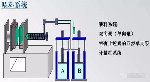 可上下移动送料,能够很好的保持压力,由于 A、B 泵之间相连,并同步由