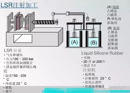 液态硅胶(Liquid Silicone Rubber),分为 A 胶与 B 胶,利用定量装置控制两者为1:1 之比例,再透过静态混合器(Static Mixer)予以充份混合,注入射出料管后再进行射出成型生产。将液态硅胶射入热浇道模具,制作硅胶制品,可达到一次成型﹑无废料及可自动化等优点。